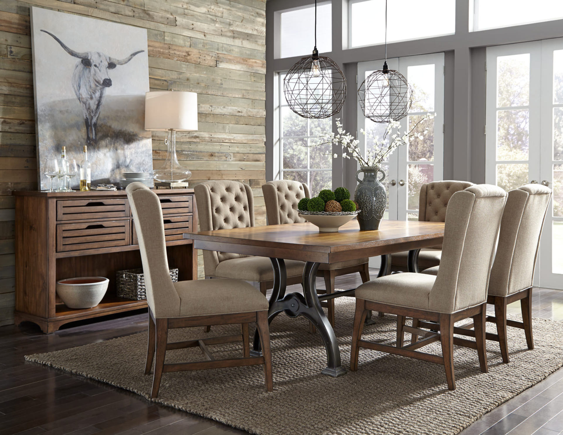 Think about the ambiance you want in the room you plan to “metallicize.” In a refined living room, it’s tough to beat gold and silver. For a more modern look, consider chrome and copper. For a different take on contemporary, try stainless steel, particularly in a high traffic area. If you’re aiming for a rustic look in the kitchen (or in any room of a cabin or farmhouse style home) you might like brass and wrought iron. The right table and chairs can create the feel of an industrial kitchen, as well as stools positioned around a counter or island.