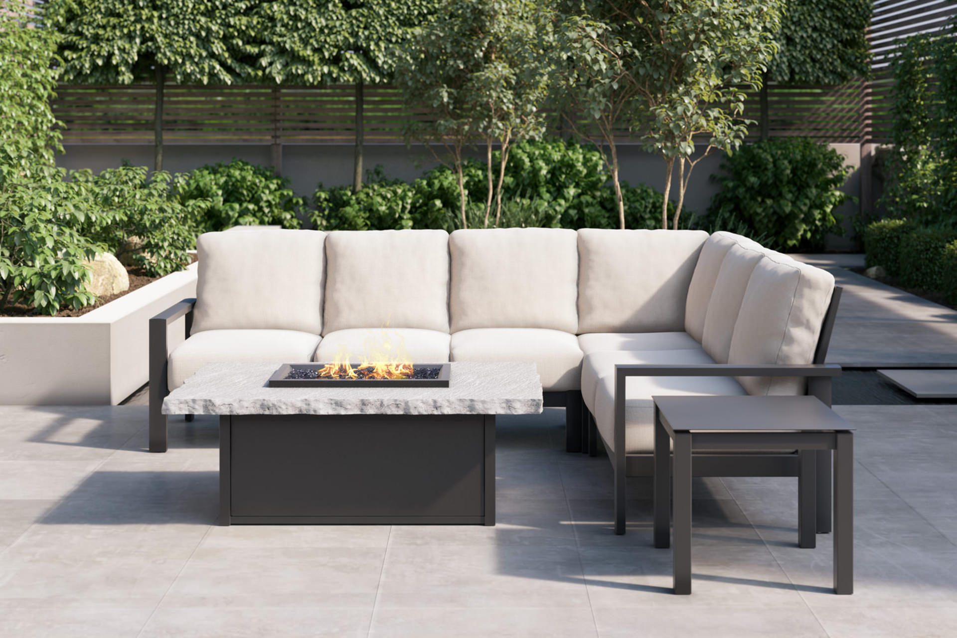 With custom ordering, you can design U-shaped or L-shaped sectionals sized perfectly to your layout, select individual units to create intimate conversation zones, and add armless chairs, chaises, or ottomans to extend your lounging space. Then, you can reconfigure your space for fall with a fire table added for extending the season.