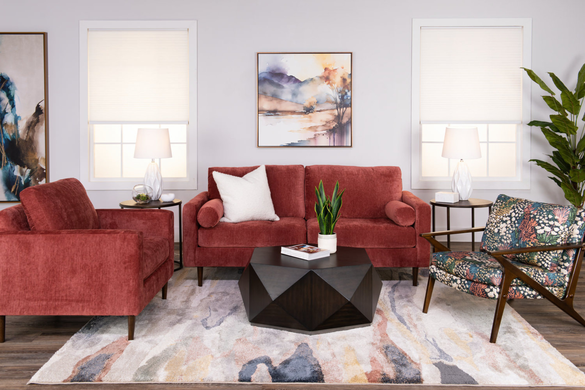 Design Tip: Try grounding your space with bold upholstered furniture, like a jewel-toned velvet sofa or a dramatic accent chair in a rich red or purple. From HOM, look for sofas in lush textures and daring hues. Choose furniture that offers customization so you can choose just the bold fabric or leather look that you love. You can also layer colorful accent pillows and throw blankets across more neutral bases to ease into the trend.