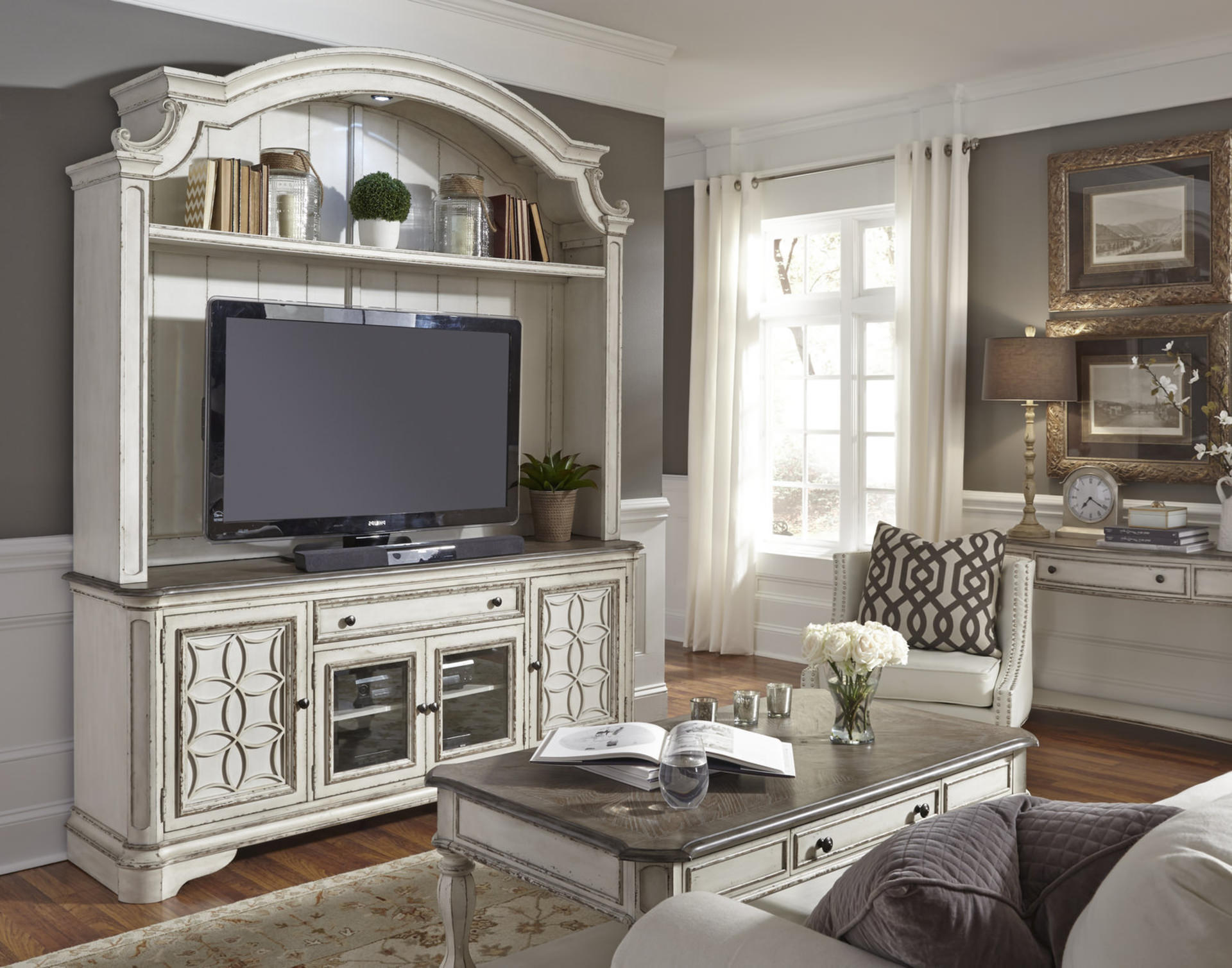 If you prefer to mount your TV an open console can still be used for storing and displaying cable boxes, Blu-ray players and even game consoles. An open console featuring multiple shelves will help to continue the free-flowing design aesthetic of industrial and urban spaces while being functional and stylish. Larger media and entertainment centers are great for displaying not only your TV and media players but also heirlooms and decor. Grand entertainment centers double as much-needed storage while enhancing your home’s beauty and making technology feel homey. Stow away your DVDs, players, game consoles, books and so much more with a media console with hutch or piers. Some consoles even come with decorative sliding doors that are a fashionable way of hiding your TV when not in use.
