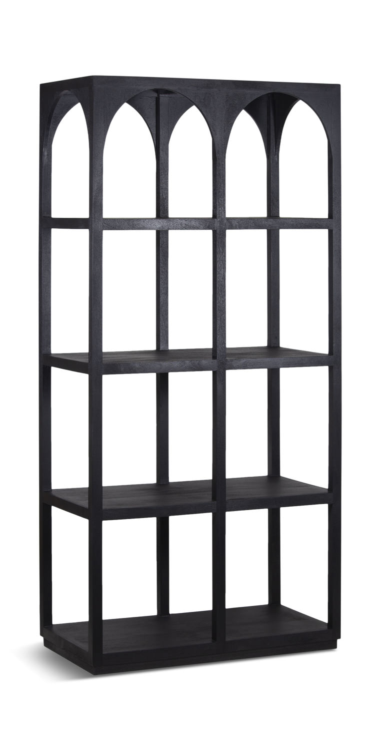 Introducing the Tarragona Bookcase from HOM Furniture, a stunning piece that seamlessly combines style with functionality. With its elegant black mango wood finish and intricate arched details, this bookcase is sure to elevate the look of any space. Featuring four spacious shelves, it provides ample room for displaying your favorite books and decorative items while offering convenient storage solutions. Whether for your home office or personal library, the Tarragona Bookcase is the perfect accent piece to add a touch of sophistication to your décor.
