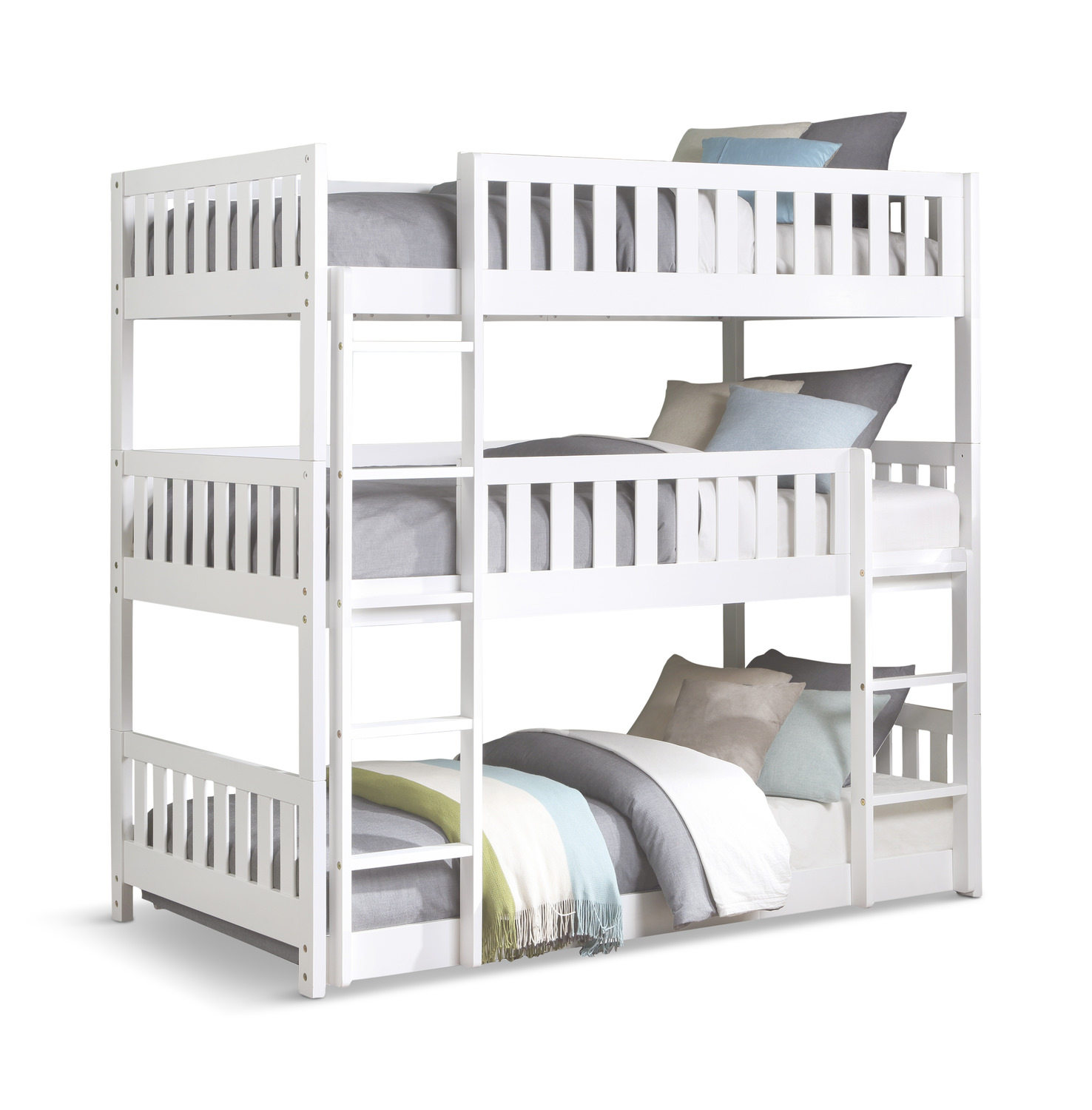 Maximizing sleep space is achieved with the stylish Atlantis Collection. This transitional Triple Bunkbed is featured in a blue finish making it an appropriate choice for a number of youth bedroom settings. Other colors of this group are stocked.