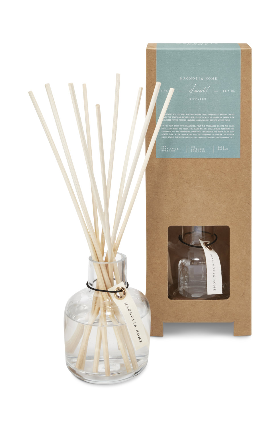 Fill your home with soft aromatic fragrance from the Magnolia Home Reed Diffuser. Available in 6 different scents, this reed diffuser will be a delightful way to make your home smell fantastic and add a lovely decorative element. The simple clear glass bottle will not contrast with any elements in your home and has a small muslin tag hanging from the neck that embodies simplified beauty. 9 reeds are included with the diffuser, so all you need to do is add the reeds to the fragrance bottles and allow 24-26 hours to allow the fragrance to diffuse. Each scent was created to be a reflection of all the values that the Magnolia Home brand stands for: bloom, love, gather, dwell, garden and restore.