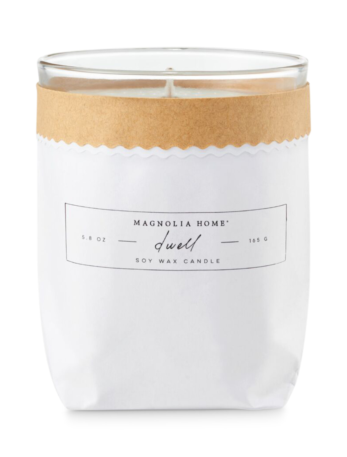 Bring in a sweet touch with the Magnolia Home Bagged Jar Candle. This candle is designed with a clear glass jar and a soy wax fill. There is then a paper bag decorative cover that has a rik-rak trim detail and contrasting kraft paper and white paper design. There are six wonderful fragrances to choose from all of which have been named each one of the Magnolia Home's core values; bloom, love, dwell, gather, garden and restore. Add one of these charming candles to your bedroom or bathroom for a great way to add a lovely scent to your home.