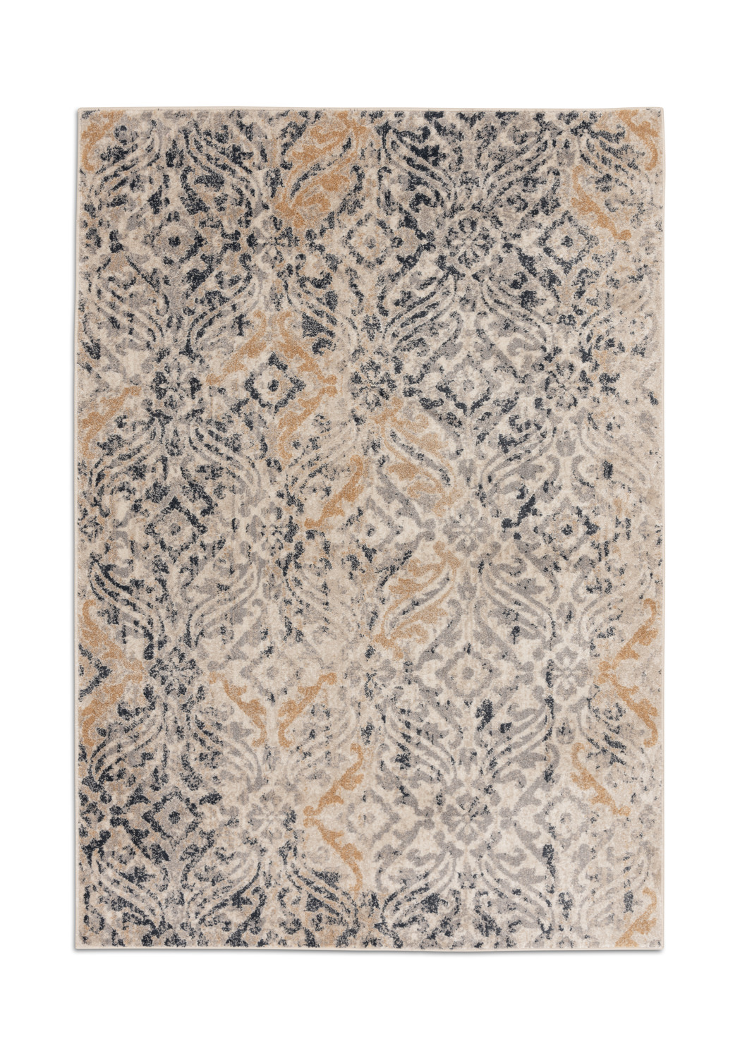 Elevate your space with a touch of timeless elegance using this stylish vintage-inspired area rug. The blend of modern distressing and classic ornate patterns brings a unique charm to any room. Featuring a sophisticated color palette of charcoal, dusty gray, and gold, this rug effortlessly complements a range of home décor styles. Discover a blend of intricate weaving techniques that enhance both the texture and color distribution, ensuring long-lasting durability. Crafted with cutting-edge technology on computer-driven looms, each rug is designed to withstand the test of time. Its stain-resistant and fade-proof qualities make it a perfect choice for high-traffic areas. Enjoy the softness of polypropylene yarns and the low-profile pile that is easy to maintain and clean, promising years of beauty and comfort. Proudly made in the USA.