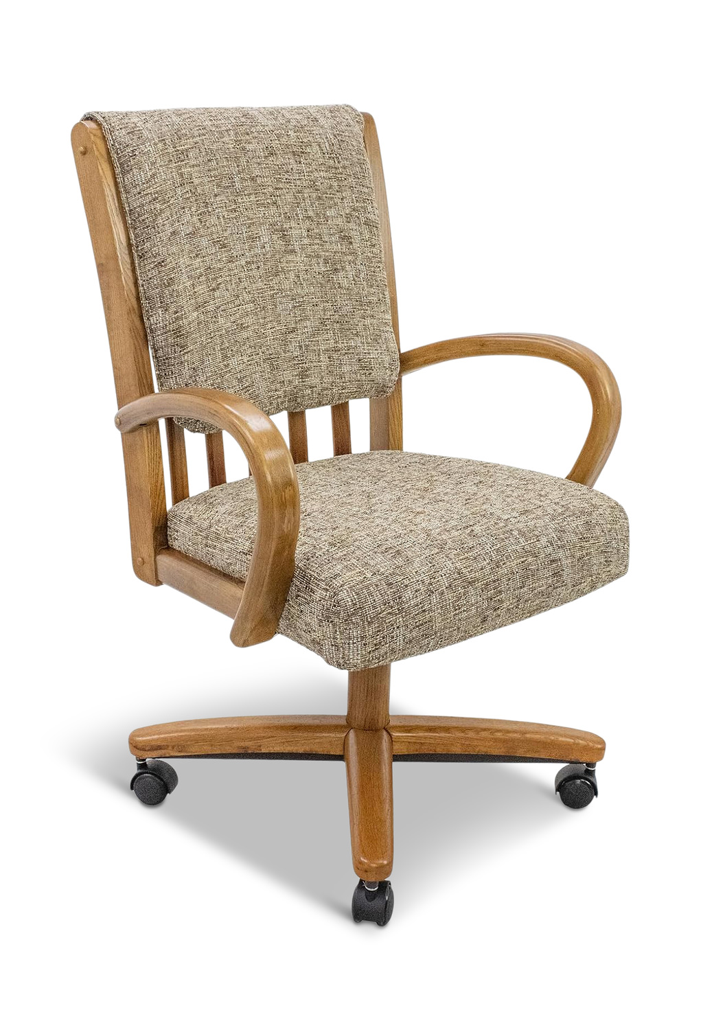 Introducing the Casual Style Swivel Chair from HOM Furniture, designed for both comfort and durability. This chair features a CertiPur 5" soft foam seat with a memory foam topper, ensuring a plush seating experience. With a solid ash arms and back frame, this chair has a weight capacity of 300 lbs, making it suitable for various body types. The beige fabric material and medium finish give it a versatile look that complements any space. This chair combines style with functionality, perfect for a casual setting. Upgrade your seating experience with this stylish and comfortable swivel caster chair from HOM Furniture.