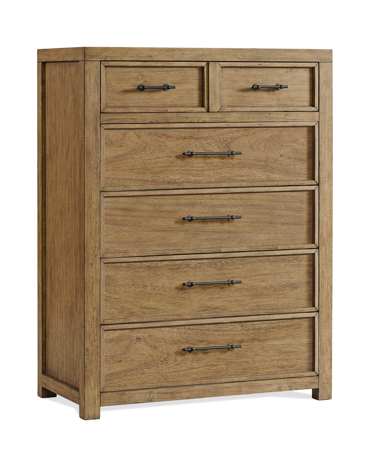 Crafted from a blend of Acacia solids and veneers, the Bozeman Chest showcases its durability and timeless appeal. Its design features framed drawer fronts and end panels, adding a touch of elegance to its overall look. The top drawers are thoughtfully adorned with industrial bar pull hardware in a sleek matte black finish, providing a modern twist to its traditional aesthetic. With dovetail joinery and ball-bearing extension guides, the five drawers ensure easy and seamless operation. The top drawer is lined with a soft felt bottom, while the bottom drawer is reinforced with a Cedar veneer bottom for added protection.