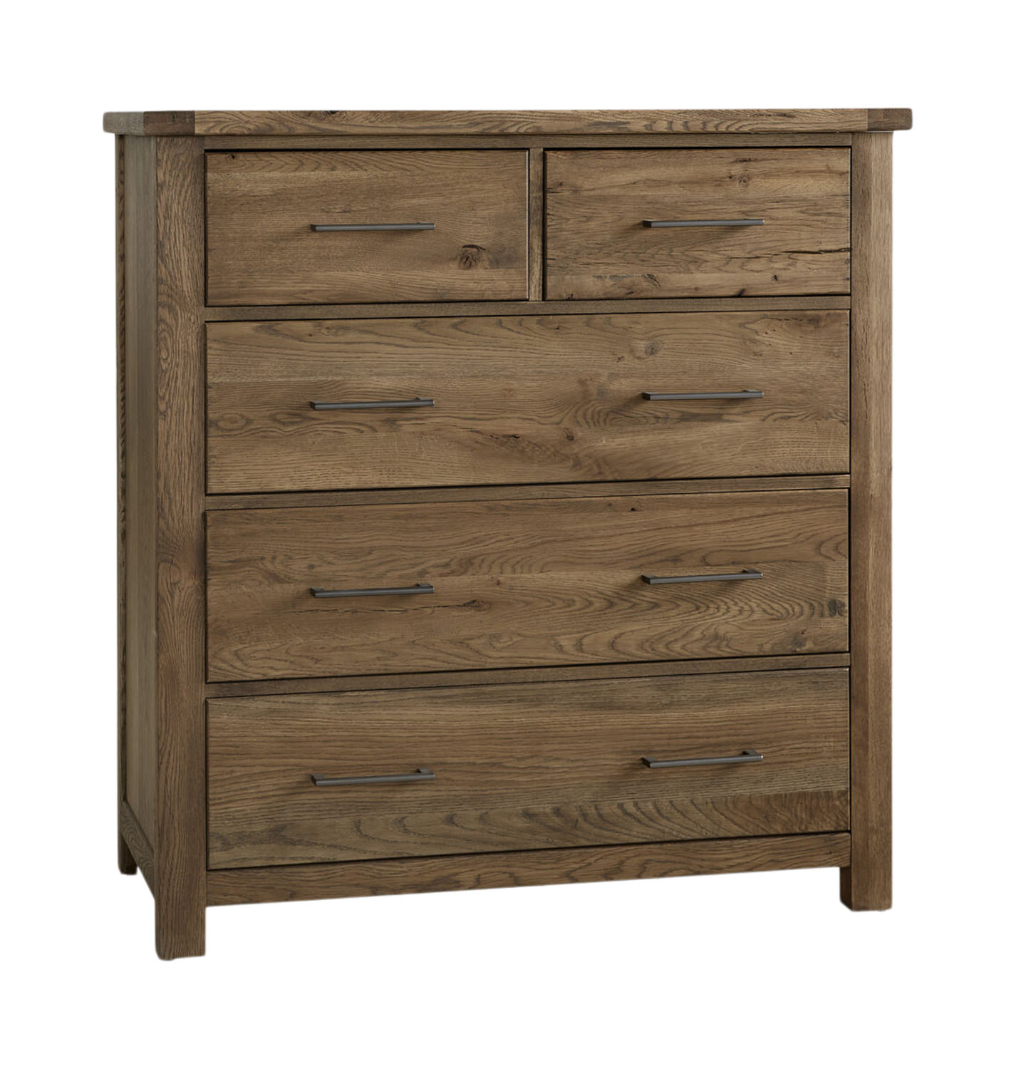 The Gable Ridge Chest with all the splits, cracks, and knot holes – all of the aging and refining that can only be provided by Mother Nature herself has 5 drawers and is 46 1/2" tall, the perfect place for a TV. It is made in the USA from American white oak solids and white oak veneers featuring custom-designed hardware. Ultra-smooth drawer interiors and self-closing dual steel ball bearing drawer guides are located under each drawer. It is crafted from honest and authentic materials with American craftsmanship. Vaughan Bassett’s products comply with ASTM International F2057, a voluntary stability standard for clothing storage furniture. Furniture tip restraints and instructions for installation are included.