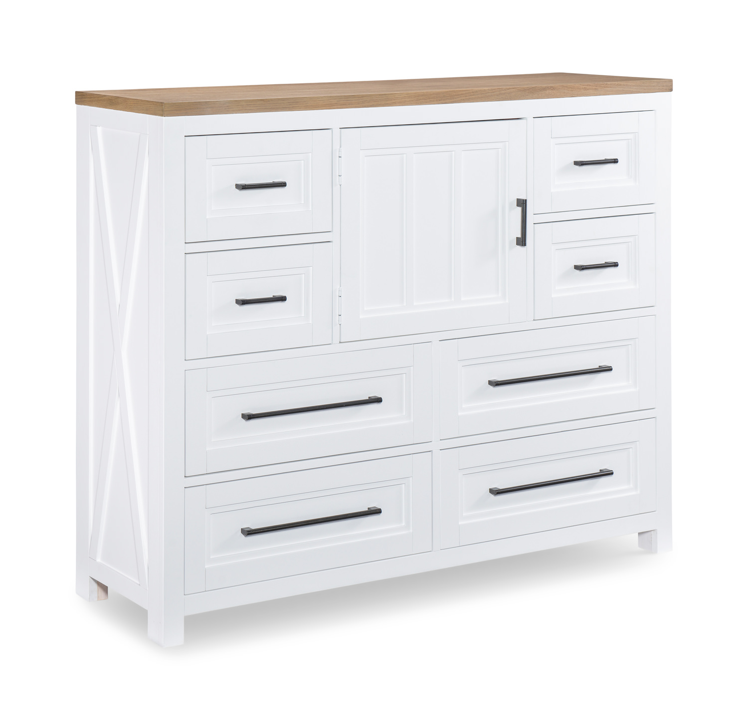 The Palmer Bureau Chest details block feet, beveled framed drawer fronts, planking and X motifs create visual interest in a modern way and without feeling too cluttered. Harvest oak tops on quartered white oak veneer sit atop natural white painted base. Enjoy the space of the 8 drawers with a felt lined top drawer. Select items offered in aged black that repeats the finish on hardware and accents.