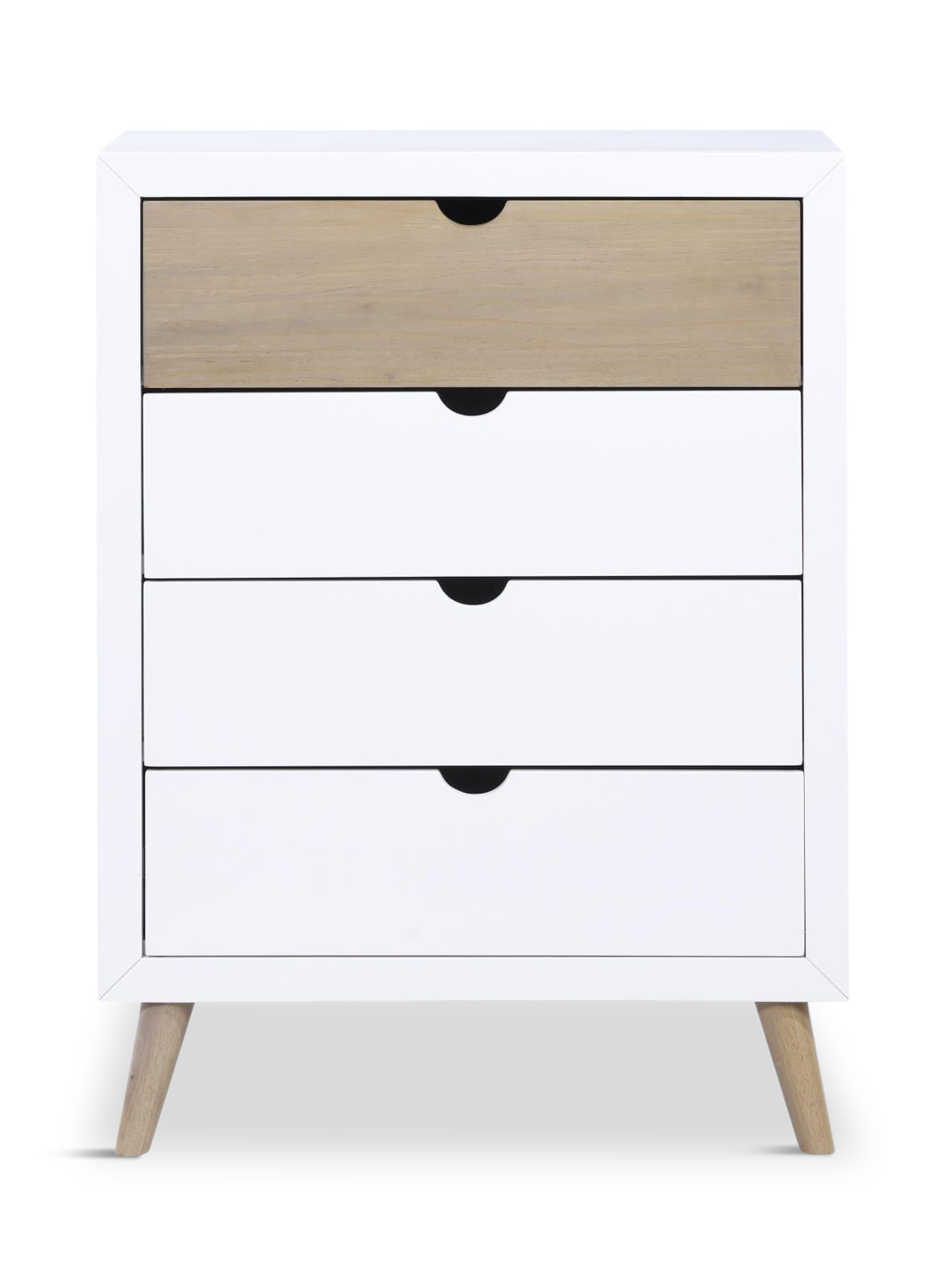 Enhancing your child's bedroom with a stylish touch, the Sunland Dresser offers a delightful and practical upgrade to their living area. Combining a charming white and natural pine veneer finish with a mid-century modern aesthetic, this collection boasts a timeless appeal. Featuring a unique design element, the chest showcases a neutral finish on the top drawer and white fronts on the bottom drawers. The drawers are equipped with grooved hand openings in the center of each front, allowing for smooth and convenient access to their contents.