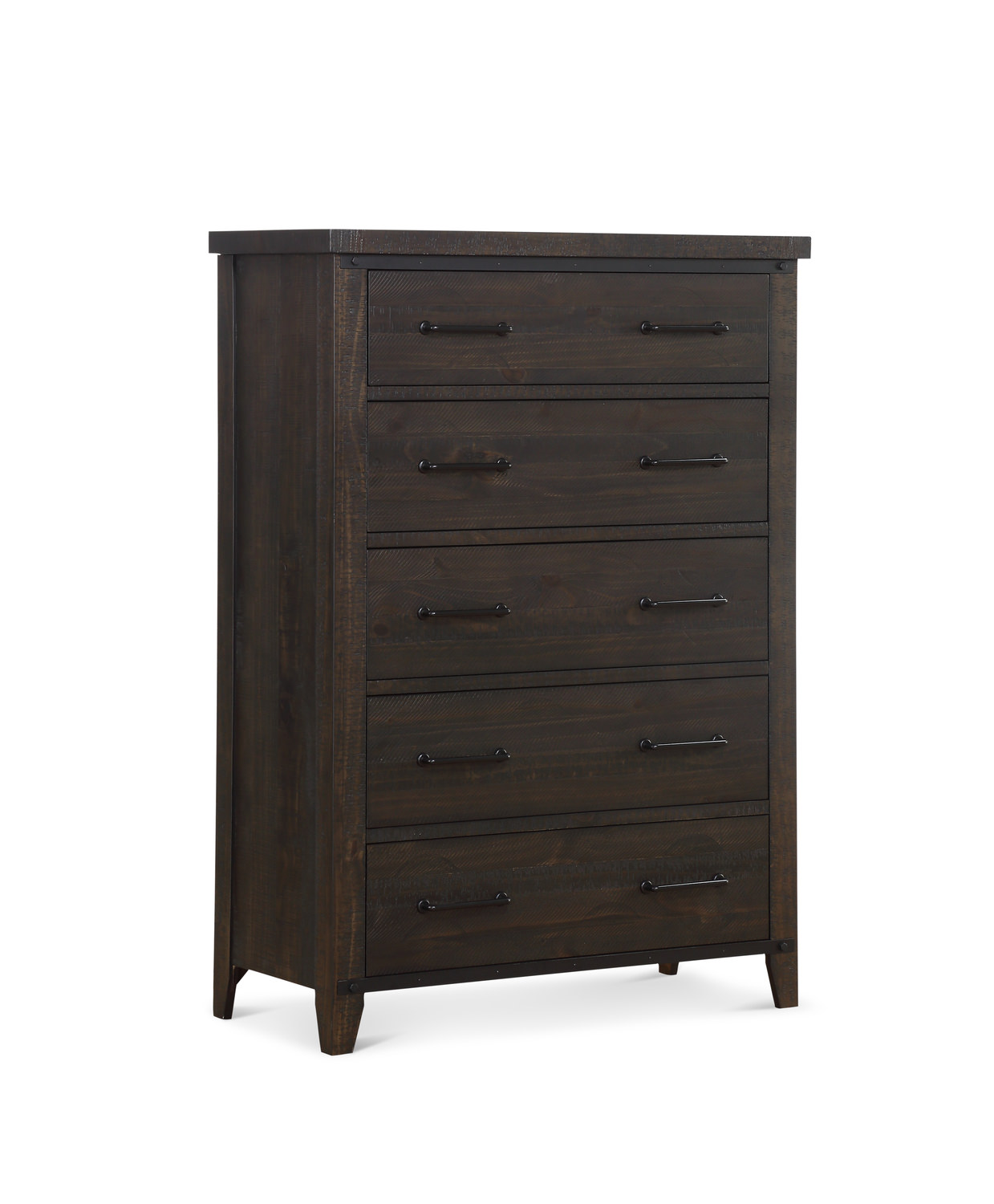 Five large drawers with quality English dovetail drawer composition and pairs of rustic bar handle hardware adorn the face of the Urban Barn Chest. The simple lines of the pine solid and veneer storage piece are drenched in distressed design. Each drawer functions on soft close drawer glides which are beautifully functional and fashionable. Chest stands elevated on four angled feet delivering the demeanor and peaceful nature desired of this handsome Urban Barn bedroom collection.
