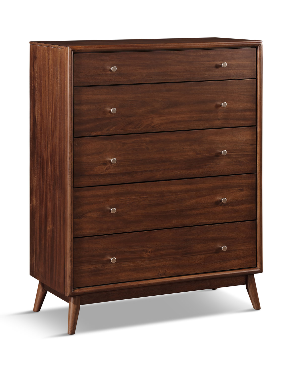 Introducing the Wexler Chest for the Uptown Gallery, a perfect blend of mid-century modern design and timeless elegance. Crafted with solid rubberwood and acacia veneers in a medium brown finish, this chest exudes sophistication and style. The flared legs add a touch of retro charm, while the soft closing drawer glides ensure smooth and quiet operation. With a felt-lined top drawer and a cedar-lined bottom drawer, the Wexler Chest provides ample storage space for your belongings while keeping them safe and organized. Add a touch of luxury to your bedroom with this beautifully crafted piece that perfectly combines form and function.