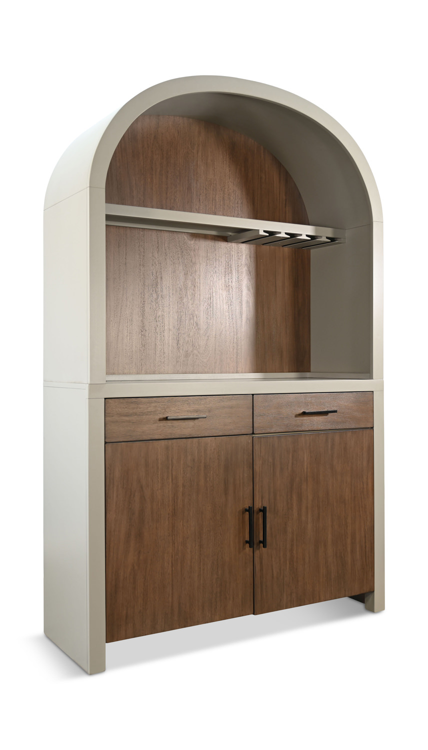 Introducing the Arch Wine and Coffee Bar from HOM Furniture, a stylish addition to your home. This two-tone wine cabinet features a unique arch design, adding a touch of elegance to any space. The top recessed shelf provides convenient storage for wine glasses underneath, while the ample lower storage, including two drawers and two doors, offers plenty of space for all your bar essentials. With a sleek grey exterior and rich warm brown cabinetry, this piece will effortlessly complement your existing décor. Perfect for entertaining or simply enjoying a relaxing evening at home, the Arch Wine and Coffee Bar is sure to impress your guests and elevate your home bar experience.