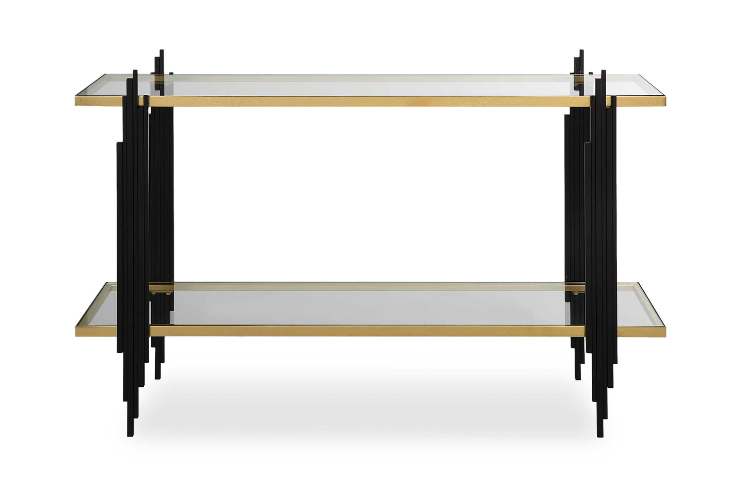 - Gold Leaf Shelves Seem To Float Between Matte Black Iron Legs Reminiscent Of A Cityscape. Two Shelves Are Clear Tempered Glass.