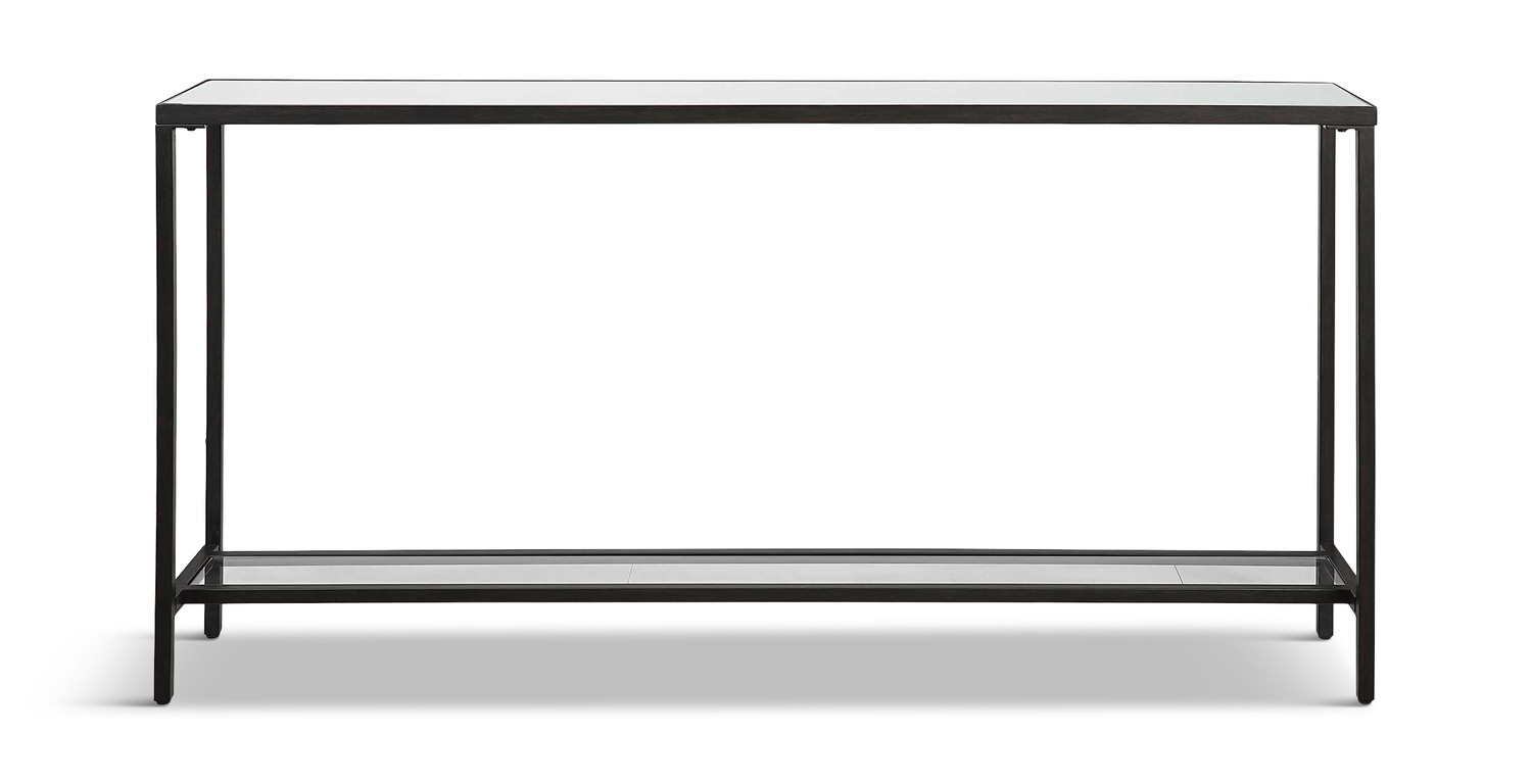 - Classic And Minimalistic, This Narrow Console Table In Steel Is Finished With A Streamlined Rustic Black, Inset With A Beveled Mirrored Top, And Gallery Shelf In Clear Glass.