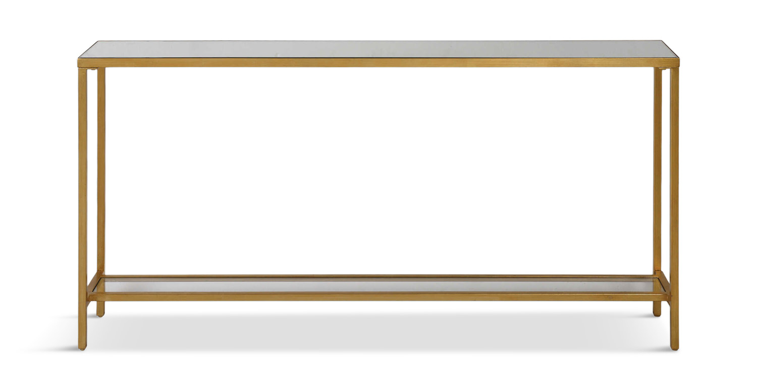 - Classic And Minimalistic, This Narrow Console Table In Iron Is Finished With Lightly Antiqued Gold Leaf, Inset With A Beveled Mirrored Top, And Gallery Shelf In Clear Glass.