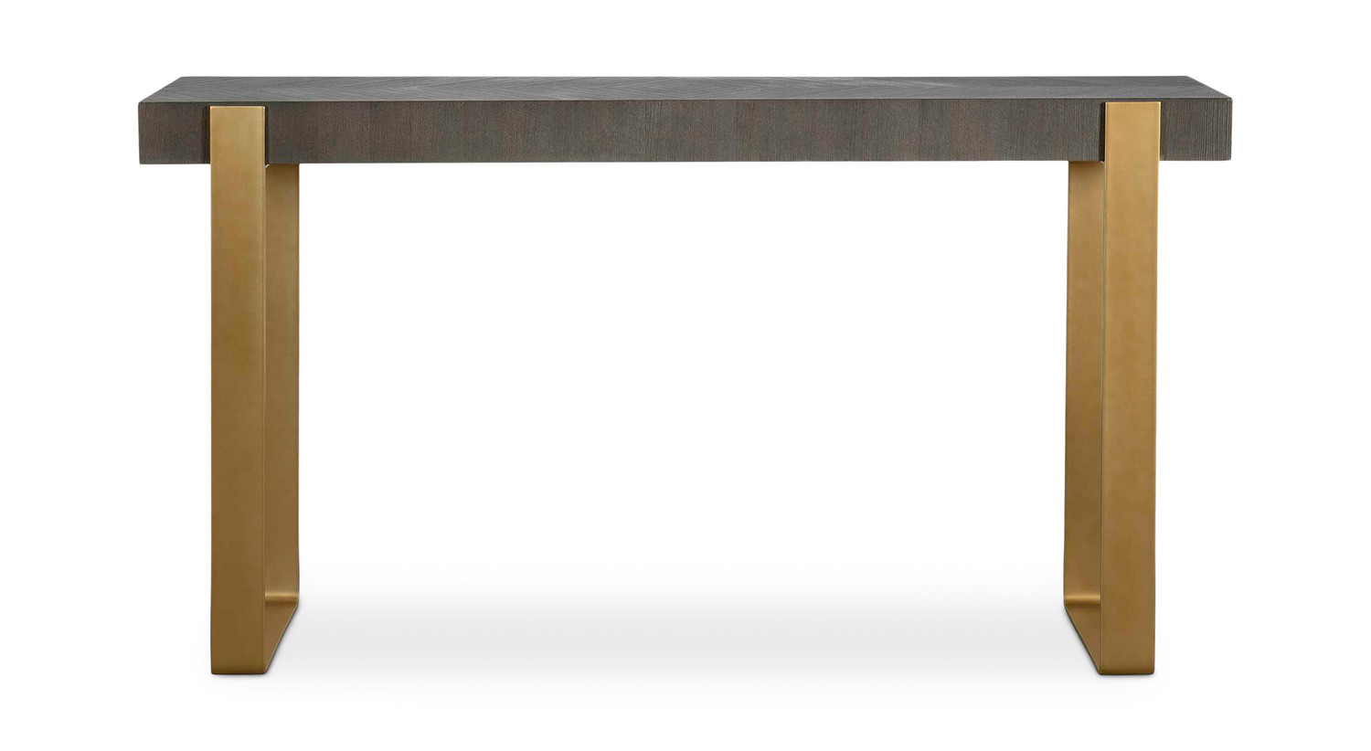 • Contemporary In Style, This Console Features A Striking Diamond Ash Veneer Top In A Dark Walnut Stain With Light Gray Glazing. The Iron Strap Legs Are Finished In A Warm Brushed Brass.