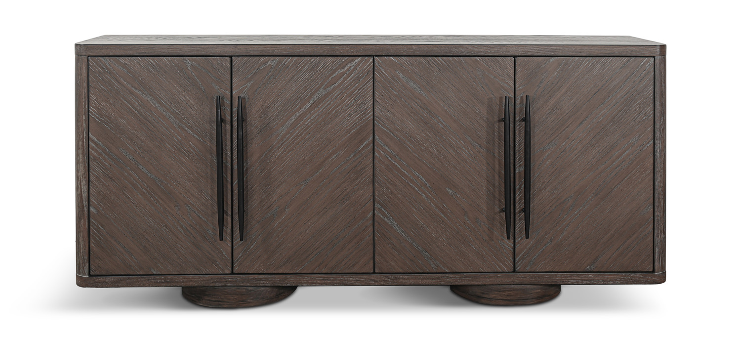Introducing the Malibu Cabinet from HOM Furniture, a statement piece that effortlessly combines style and functionality. This accent cabinet features four doors with sleek black finished hardware, adding a touch of modern elegance to any space. What sets this cabinet apart is its unique round pedestal feet, setting it apart from other accent cabinets. The herringbone grain pattern adds a subtle yet striking detail, while the rich, warm brown finish enhances the overall charm of the piece. Elevate your home décor with the Malibu Cabinet and make a stylish statement in any room.