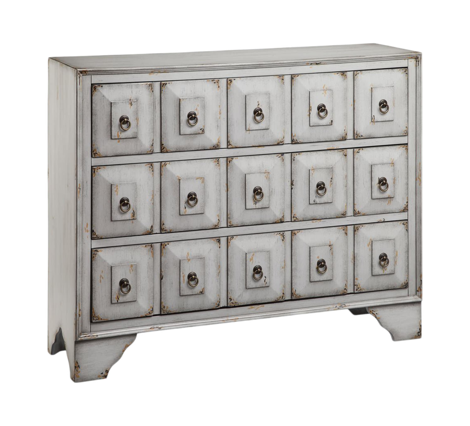 In an apothecary style, the three drawer Mohala Chest is finished in a hue of Aegean Mist. A soft grey, this hand-painted piece offers drop-ring, and pull hardware, on each of the built-out, square, drawer faces. A trim 12.25" depth, this Mohala Chest, requires a small footprint and makes an excellent addition to any entryway, hallway, or room with restricted space.