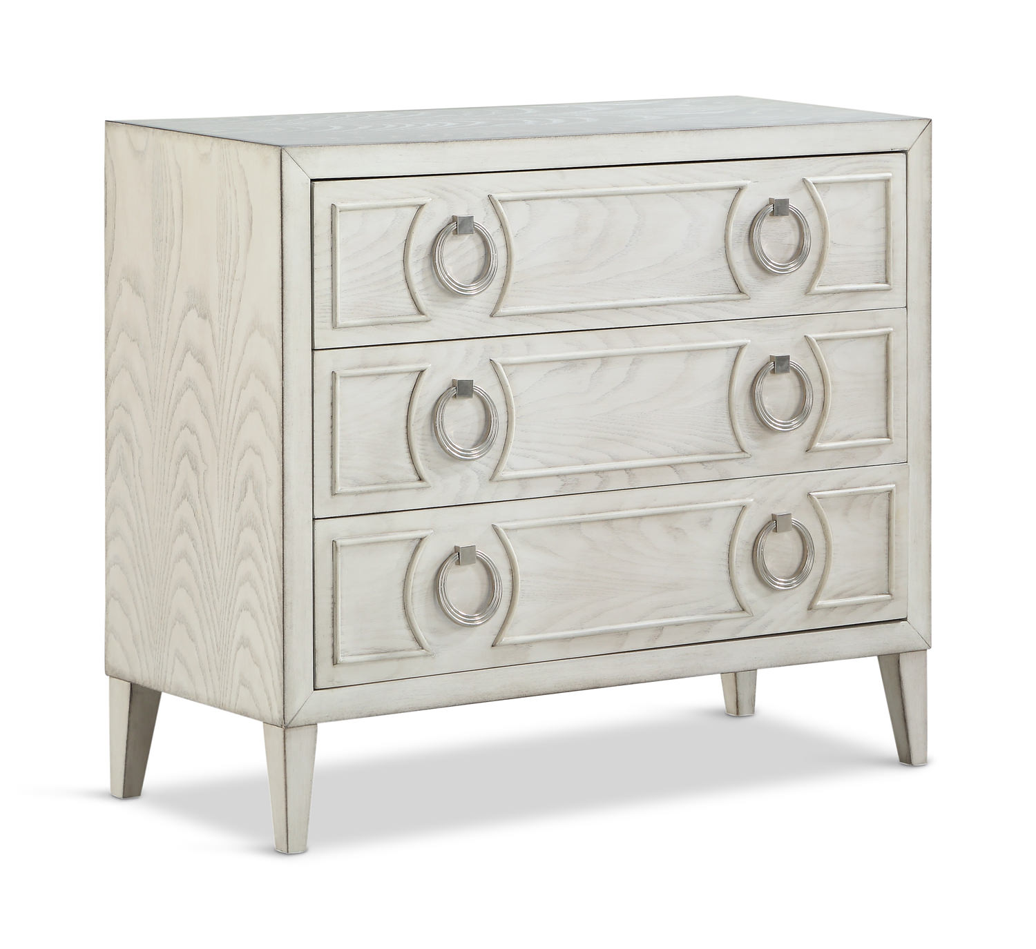 The three drawer Reeds Chest provides a contemporary storage solution for a bedroom or any room that needs a little character and function. Silver toned legs add subtle glam and the sophisticated drawer fronts are adorned with designer satin nickel hardware.