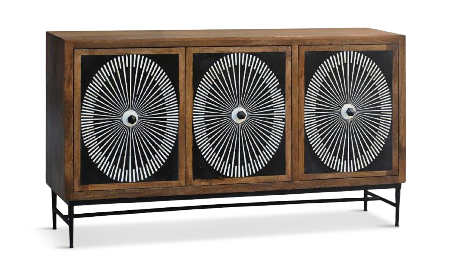 Introduce a touch of adventure into your home decor with the HOM Valcourt 3-Door Cabinet. Crafted from mango wood and featuring a two-toned finish, this transitional piece adds an element of sophistication to any room. The cabinet boasts three doors, with metal hardware, in a luxe brown finish; bone inlay accents and handcrafted details make it truly unique. Meticulous attention to detail, with ample storage space and stylish design, the HOM Valcourt 3-Door Cabinet will be the perfect accent piece for any space.