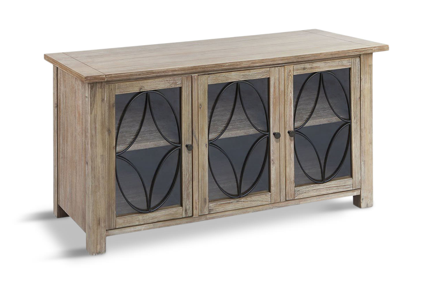 Standing on four block feet, the Waterford Credenza, has 3 clear glass front doors with metal, black geometric, overlays. A soft oval shape with a centered, diamond shape. The door pulls, are also a dark finish and coordinate with the geometric design. A bronze finish over the entire piece gives a final, warm touch.