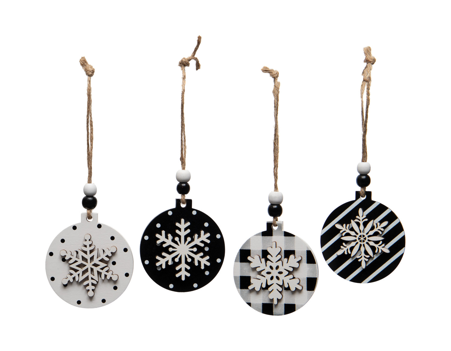Your Christmas tree will have an even more charming look after hanging these Assorted Snowflake Ornaments on it. The round faux wood pieces have stripes, circles or checkers patterns on them. Includes beads on the jute yarn. Each sold separately.
