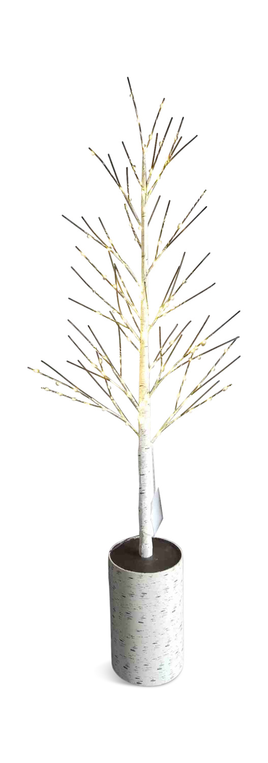 Pre-lit Birch Trees are designed for holiday indoor displays. Crafted with micro copper wire lights (bulbs are welded to the wire for durability) on wire branches with a metal pole truck and hand-wrapped with paper tape that has a birch finish. Assembles on the included base quickly and easily shaped branches create a tree silhouette with a warm white microlight glow. The lights are powered by a low voltage transformer plug at a standard home outlet, US, that has a long cable to work with from the tree base. Shown in select showrooms or available online with pick up at select HOM locations.