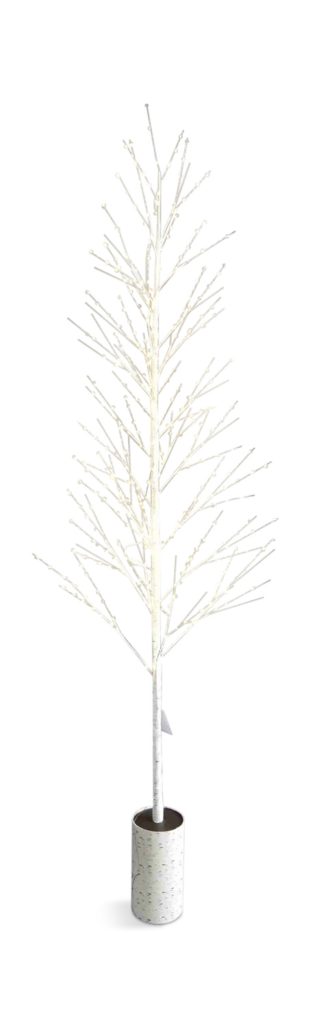 Pre-lit Birch Trees are designed for holiday indoor displays. Crafted with micro copper wire lights (bulbs are welded to the wire for durability) on wire branches with a metal pole truck and hand-wrapped with paper tape that has a birch finish. Assembles on the included base quickly and easily shaped branches create a tree silhouette with a warm white microlight glow. The lights are powered by a low voltage transformer plug at a standard home outlet, US, that has a long cable to work with from the tree base. Shown in select showrooms or available online with pick up at select HOM locations.