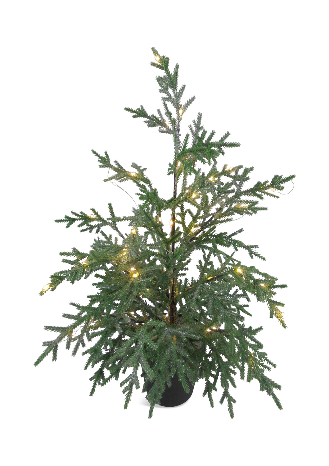 Looking for that smaller tree for just the right spot? It should look natural and need little work to be ready to display. Add a potted short needle fir to the collection of holiday decoration. Short needle fir pine tips are crafted from molded PE tips and filled in with PVC pine. This 24" natural-style tree includes a potted base and has battery-operated LED lights, 2AA batteries (sold separately). This tree will at home in dorm room, assisted living space, entryway, guest bedroom or office to add Christmas cheer. Display with or without holiday decor', this tree could be on display all winter long. Shown in select showrooms.
