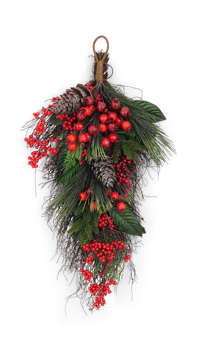 This beautiful teardrop swag features mixed pine greens and berry branches with pine cones and berries. This piece is 30" long and perfect for your winter decorating.