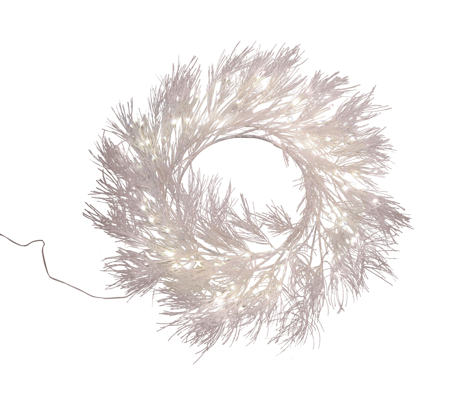 The 48" White Glitter LED Wreath comes with 102 warm white LED lights that are energy-efficient and long lasting. This wreath can be displayed on doors, walls and indoor windows.