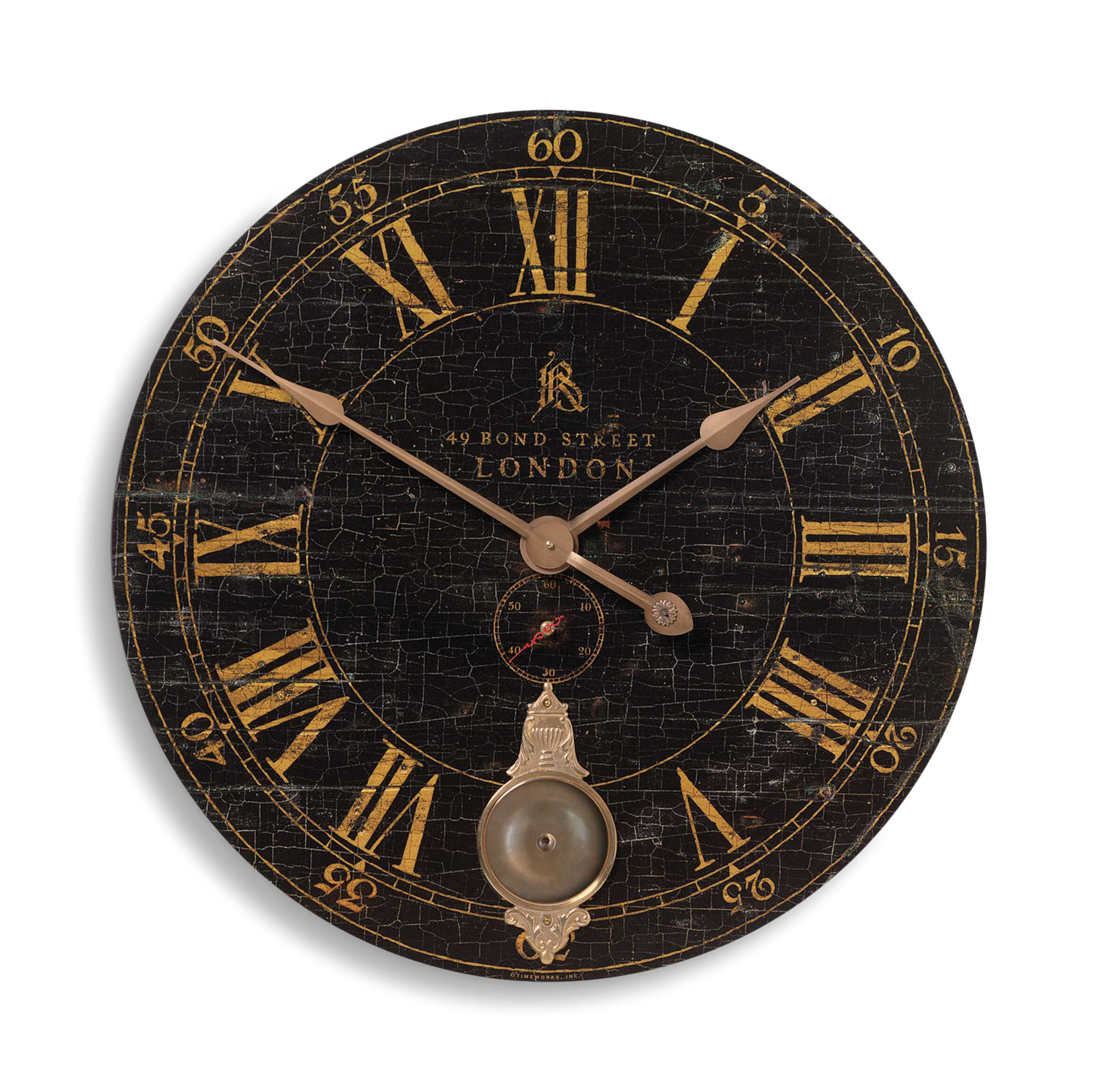 - Laminated Black Clock Face With A Weathered Crackled Look, Cast Brass Details And Internal Pendulum. Quartz Movement Ensures Accurate Timekeeping. Requires Two "AA" Batteries.