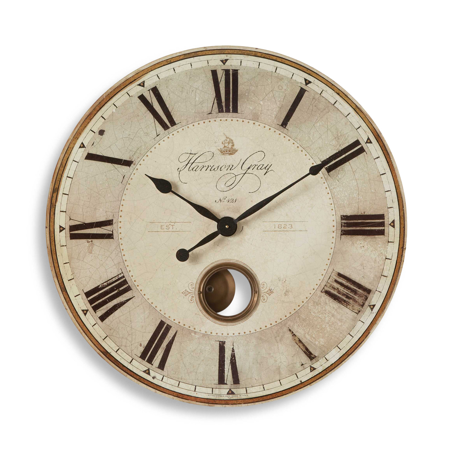 • Weathered Laminated Clock Face With Brass Center Components And Internal Pendulum. Quartz Movement Ensures Accurate Timekeeping. Requires Two "AA" Batteries.