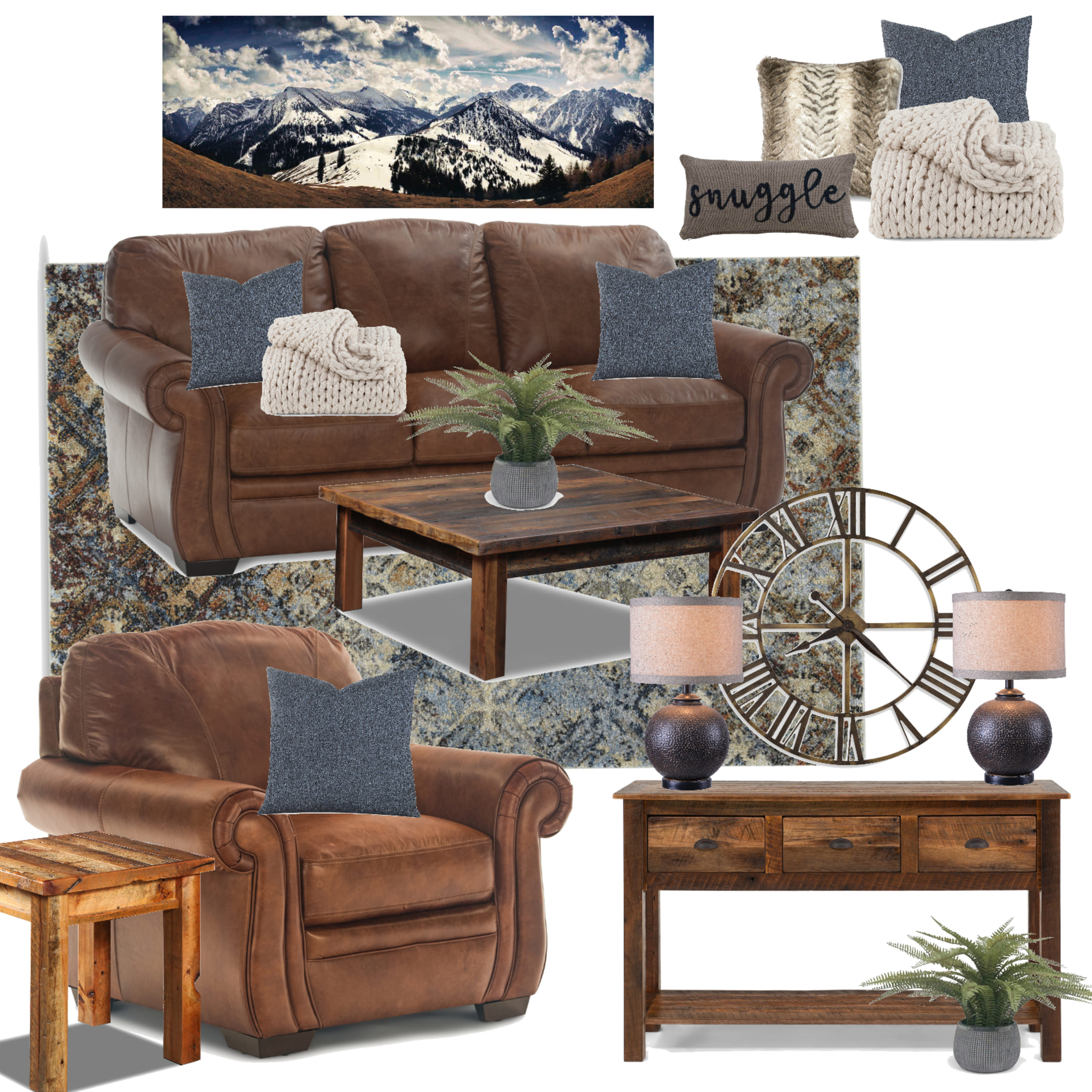 Start with a comfortable leather sofa, layer in earthy color tones, natural fabrics and distressed natural woods. Add lots of accent pillows and warm blankets to cozy up to to give it a warm and inviting feeling.