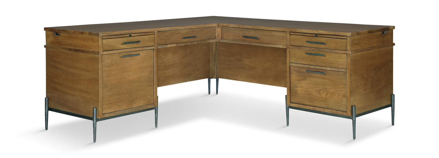 The Bedford executive L desk feature a solid mango desk top and full function interior including dual drop down keyboard drawers on both pedestals, pull out writing surface, box drawer storage, locking letter/legal file drawer, and door with pull out and power hub with 2 AC outlets, dual 5V USB 2.1A ports with surge protection. The metal legs and hardware are hand forged iron and lightly distressed iron and the mango is a rich caramel color with a waxy lacquer finish.
