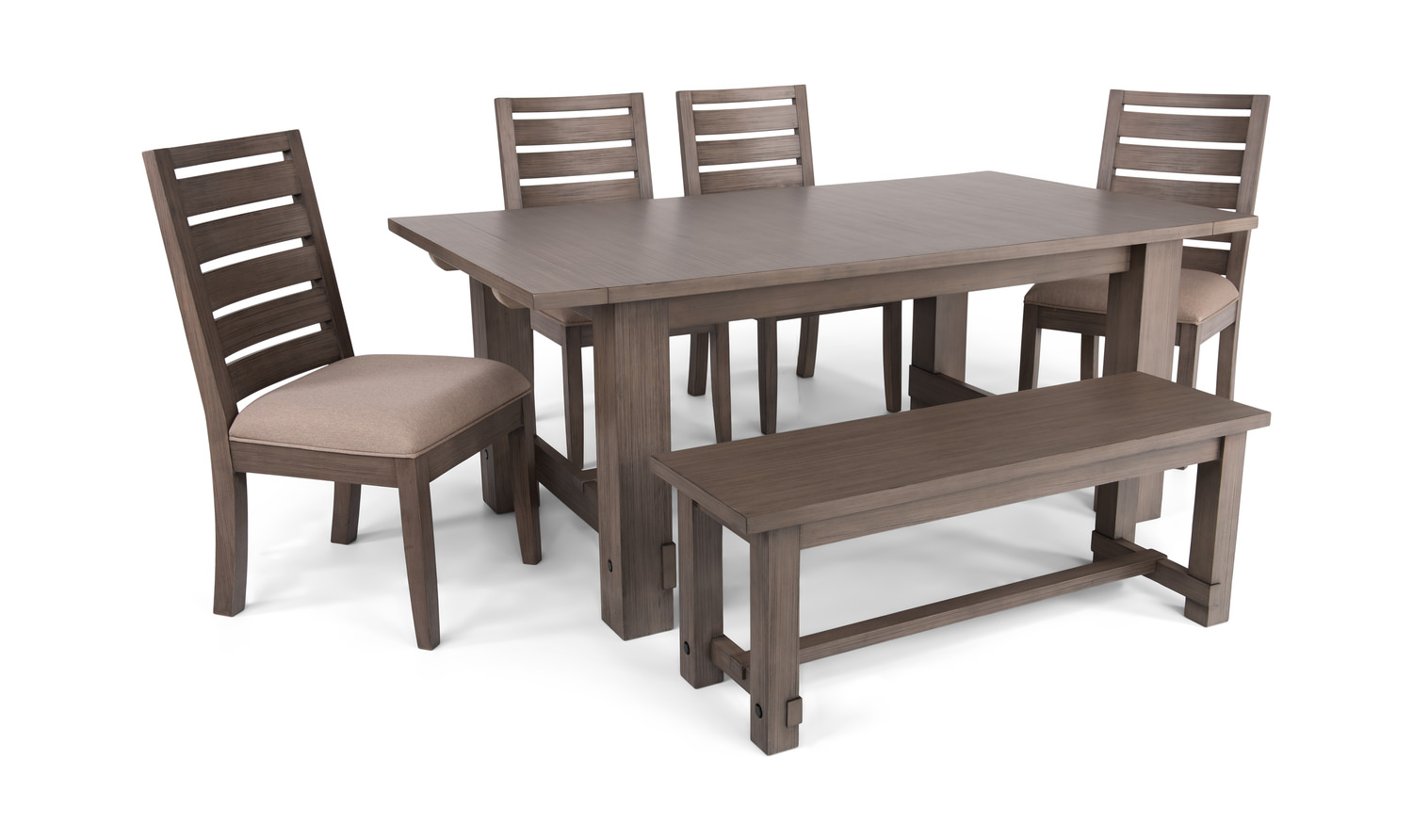 This solid mahogany Emerson Dark Taupe Trestle Table is a great addition to any large dining space. With its wire brush finish, this table is sure to make a statement in your home. This 42" x 74" table features two 16" end leaves which allow for it to extend up to 106" when fully extended, making it the ideal size for larger gatherings. The Emerson Dark Taupe Trestle Table comes complete with four chairs and a bench.