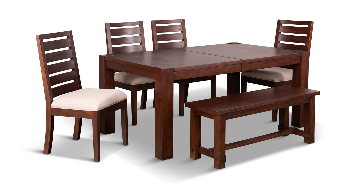 The modern, rustic Emerson Leg Table With 4 Chairs And Bench is crafted from solid mahogany with a multi-step, multi-tone wire brush finish. The dining table measures 42" x 70" and has 1-20" leaf, which expands the table to 90". This dining set includes table with 4 chairs and dining bench.