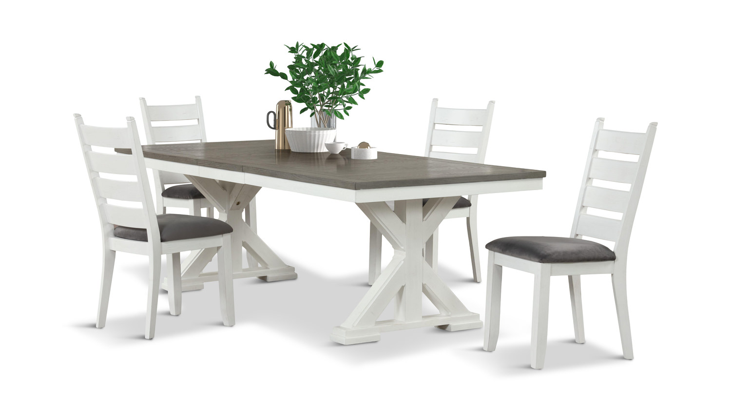 This beautiful Randall Lake Trestle Table with 4 Chairs is the ideal addition to any home. Crafted with an oak veneer top and a white/grey finish, this table is sure to be a stunning centerpiece in your dining area. The leaf included allows for extra seating when hosting guests or family dinners. Smallest: 76"W x 42"D x 30"H Fully Extended: 94"W x 42"D x 30"H