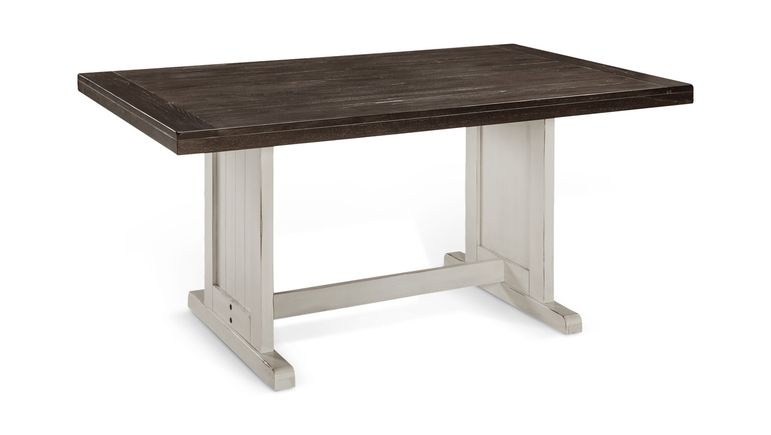 The cottage style, Carriage House Dining Table has a two tone finish of dark mahogany with white hang up and distressing and a white base.