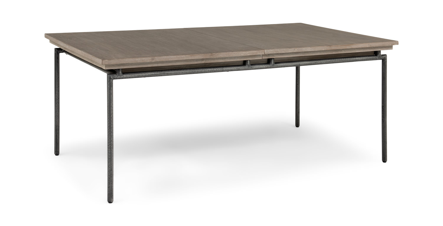The Sedona Dining Table measures 44" x 76" and has 1-20" take out leaf. Table is made of mango veneers and has an iron base.