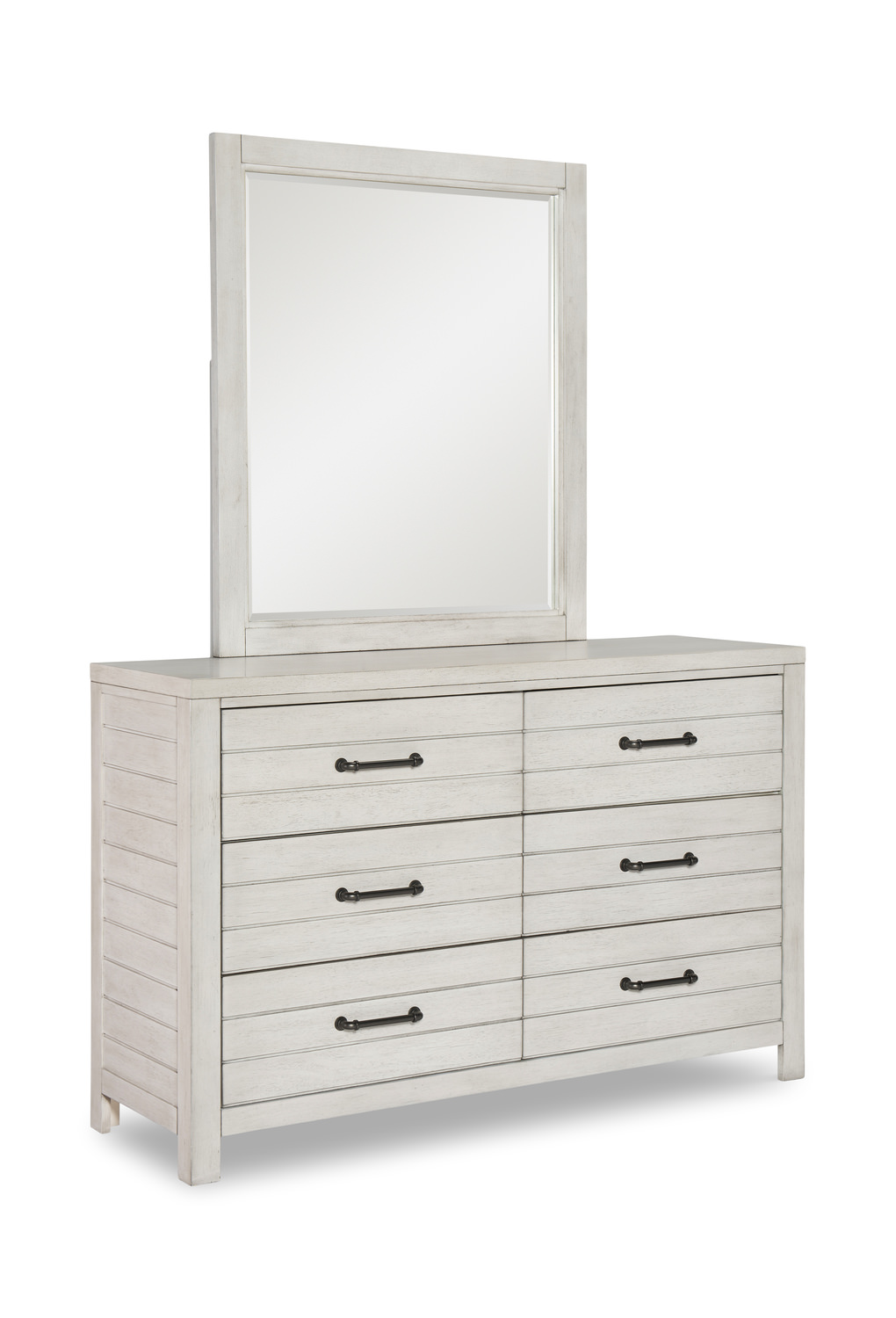 Boasting a modern rustic appearance, the Bay Lake Dresser features plank details and black iron hardware for a distinct look. It features dovetail drawers, full extension and ball bearing drawer glides. It is also stocked in brown. Mirror is sold separately.