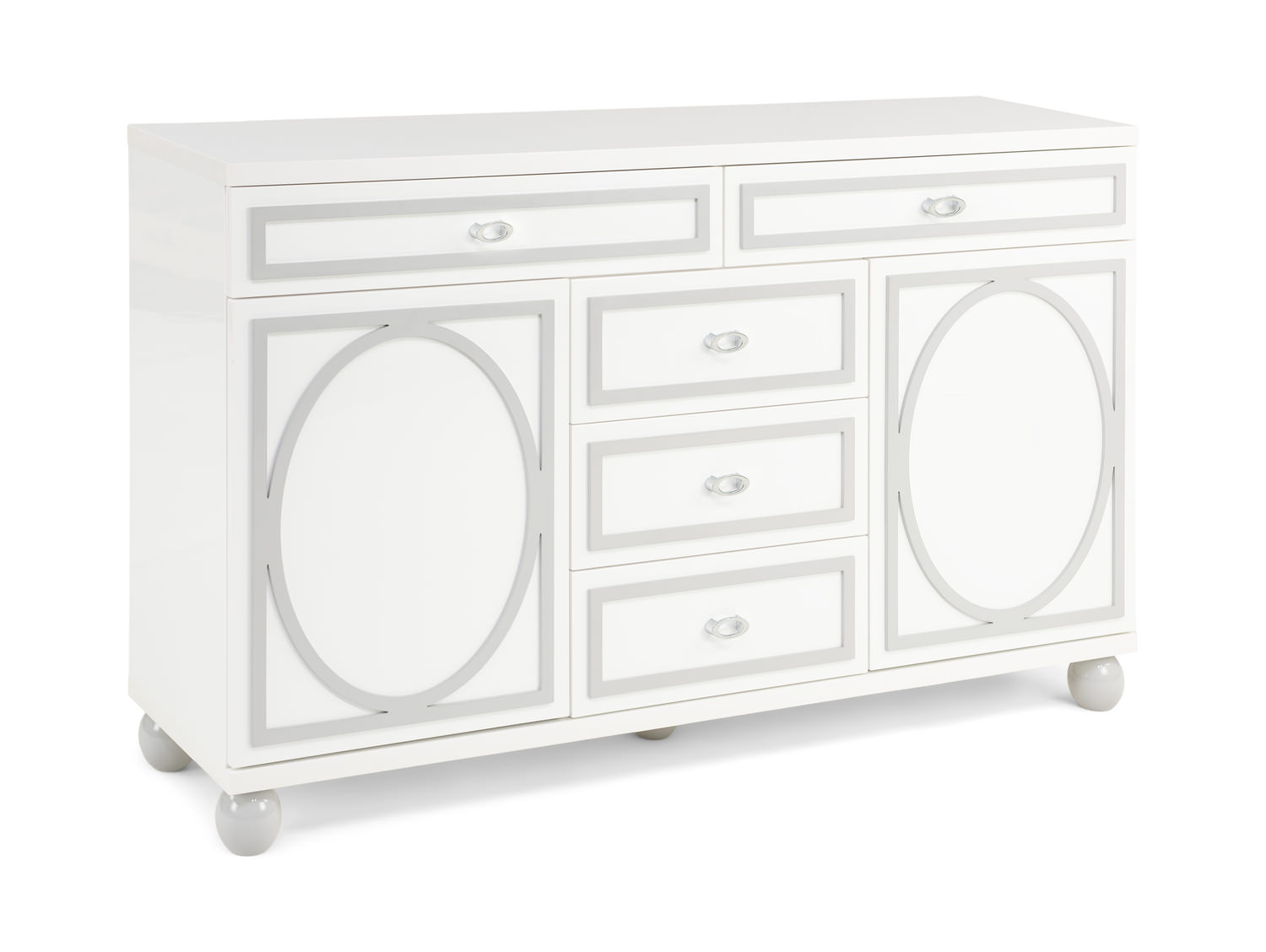 The Citadel Dresser features clean lines with a touch of art deco in a glossy two-toned finish. Features include five velvet lined drawers, two cabinets with a hidden jewelry drawer and lift out tray behind the left door. The customized drawer pulls add sophistication and ties the look together.
