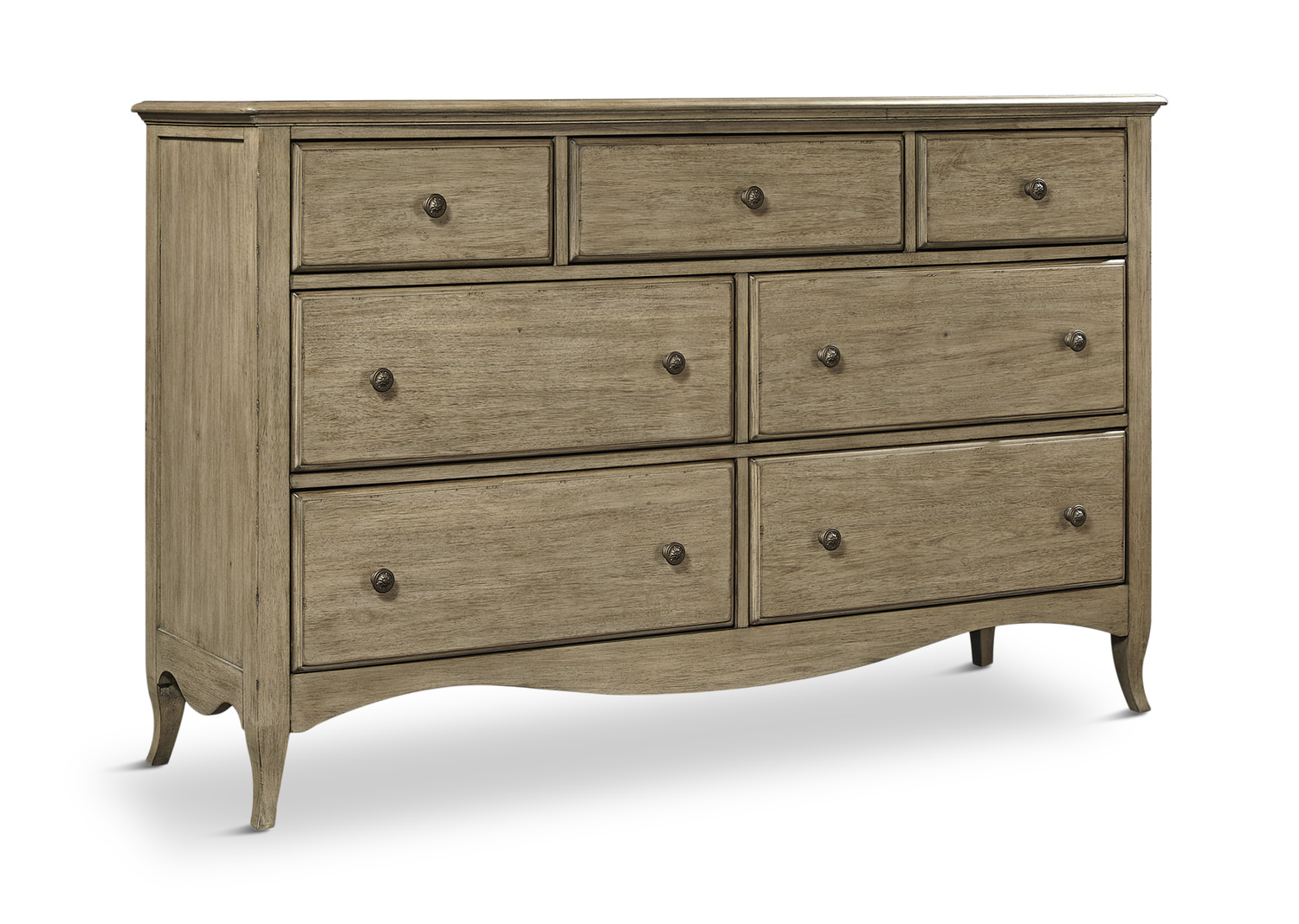 The Delilah Mink Dresser has a transitional style that will update your room yet still have a traditional flare. This dresser is made with solid rubberwood and acacia veneers that have been finished in a light grey beige coloration. There are 7 drawers to give you plenty of storage for your belongings. The top 2 drawers are felt lined and the bottom 2 are lined in cedar. The overall silhouette has straight clean lines yet the bottom has a curved detail on the apron to add a traditional vibe.