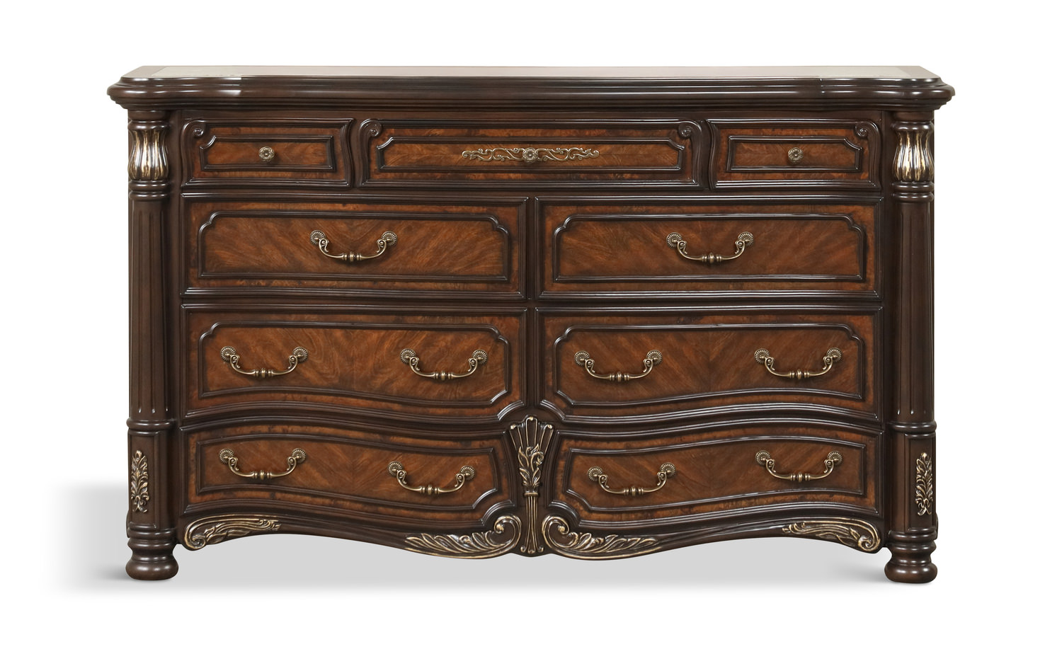 Introducing the Grand Opulence Dresser by HOM Furniture, a stunning piece that exudes elegance and sophistication. Crafted with a meticulous multi-step finish, this dresser features exquisite gold embellishments and a luxurious marble inlay, adding a touch of opulence to any bedroom décor. Constructed with a blend of solid poplar, birch, and veneers, the Grand Opulence Dresser showcases the perfect combination of durability and beauty. The use of premium poplar wood, birch wood, and high-quality veneer wood ensures a long-lasting and high-quality piece of furniture.