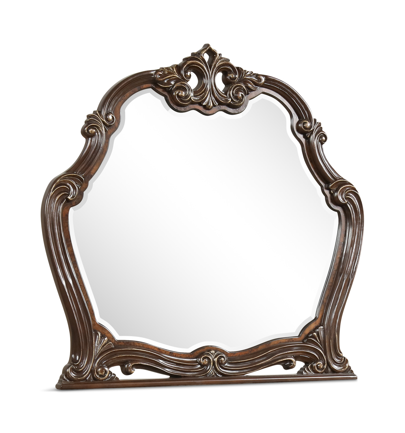 Introducing the Grand Opulence Mirror by HOM Furniture, a stunning addition to any home décor. This mirror features a clear, low-distortion beveled glass design with elegant gold embellishments that add a touch of luxury to any space. Crafted from solid poplar, birch, and veneers with a multi-step mahogany finish, this mirror exudes quality and style. The traditional design, dark finish, and poplar wood construction make it a timeless piece that will complement any room beautifully. Elevate your home with the Grand Opulence Mirror and add a touch of grandeur to your space.