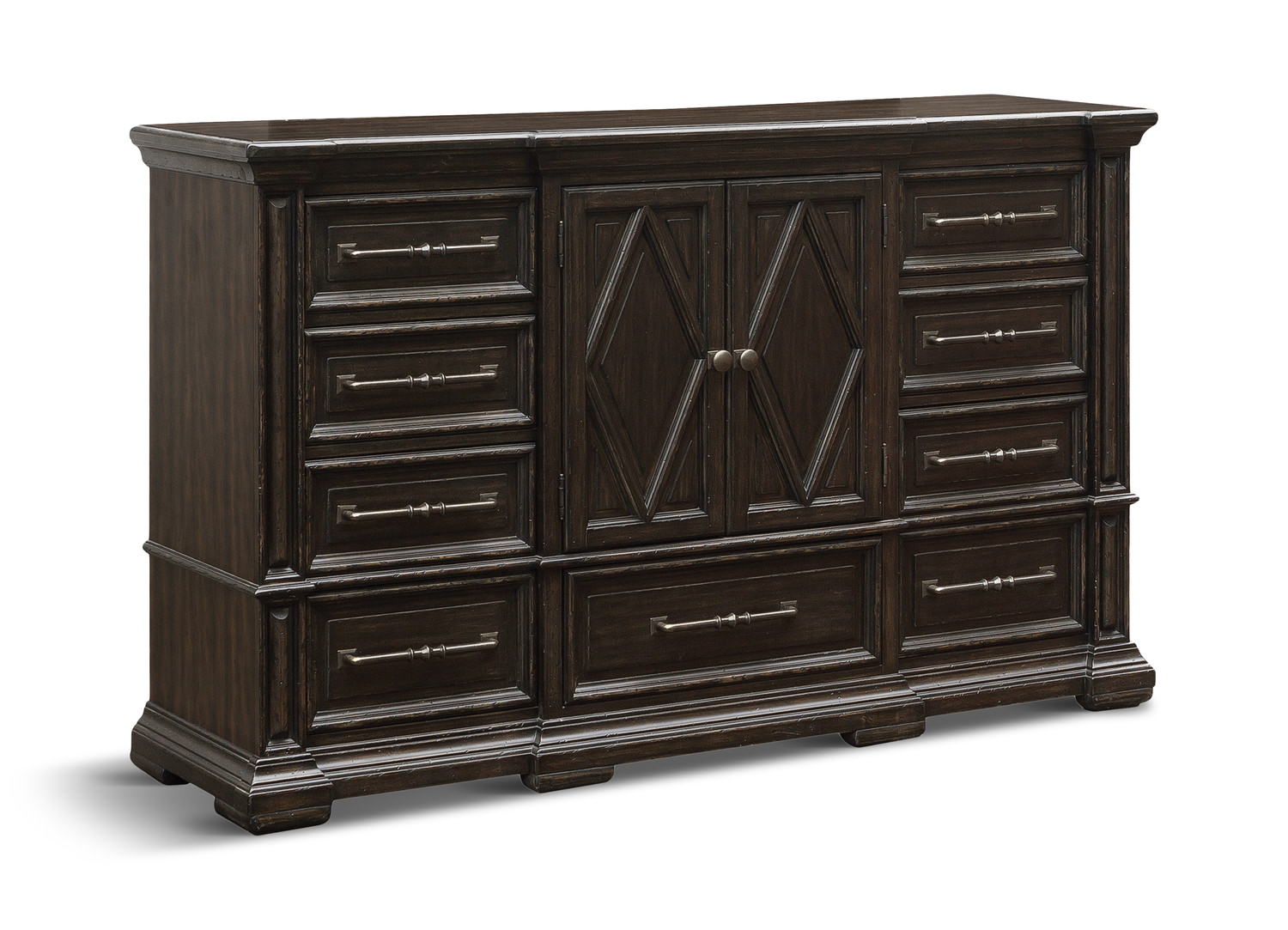 The Magnus Midnight Dresser offers full height, full depth and full width drawers for maximum storage capacity. All drawers have strong, time-tested English construction, for years of problem-free use. Plywood drawer bottoms are attached to plywood drawer sides for strength and durability. Metal side guides or wood on wood guide systems operate smoothly. Samuel Lawrence Furniture uses carefully chosen solid wood and select wood veneers over durable wood products in our furniture construction. Use of veneers enables more decorative looks unattainable with solid wood. The durable wood products used do not expand and contract with heat and cold and do not absorb moisture as much as solid wood, which results in stronger and longer-lasting furniture. This dresser has a distressed finish.