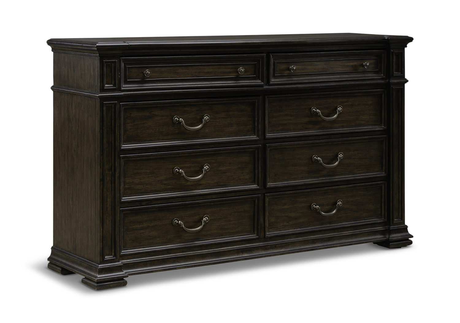 Introducing the Montgomery Dresser from HOM Furniture's Fine Furniture Gallery, where elegance meets functionality. Crafted with a blend of solid wood and veneers, this dresser exudes luxury and durability. The dark finish adds a touch of sophistication to its traditional design, making it a timeless addition to your bedroom decor. Experience the smooth and silent operation of the soft close drawer glides as you access the felt-lined top drawer and cedar-lined bottom drawer, providing ample storage space for your belongings. The custom antique brass hardware adds a touch of vintage charm to this exquisite piece.