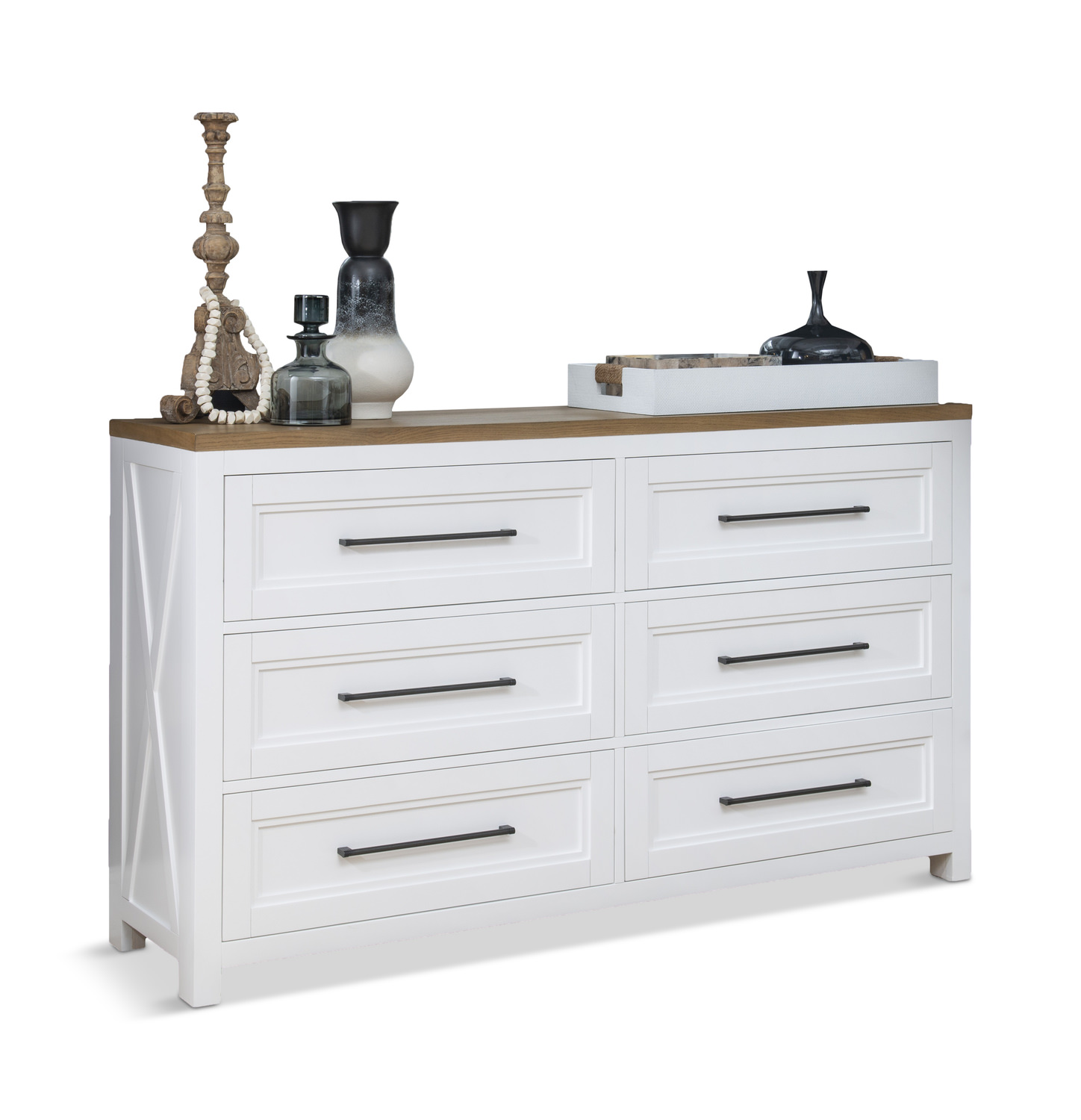 The Palmer Dresser details block feet, beveled framed drawer fronts, planking and X motifs create visual interest in a modern way and without feeling too cluttered. Harvest oak tops on quartered white oak veneer sit atop natural white painted base. Select items offered in aged black that repeats the finish on hardware and accents.