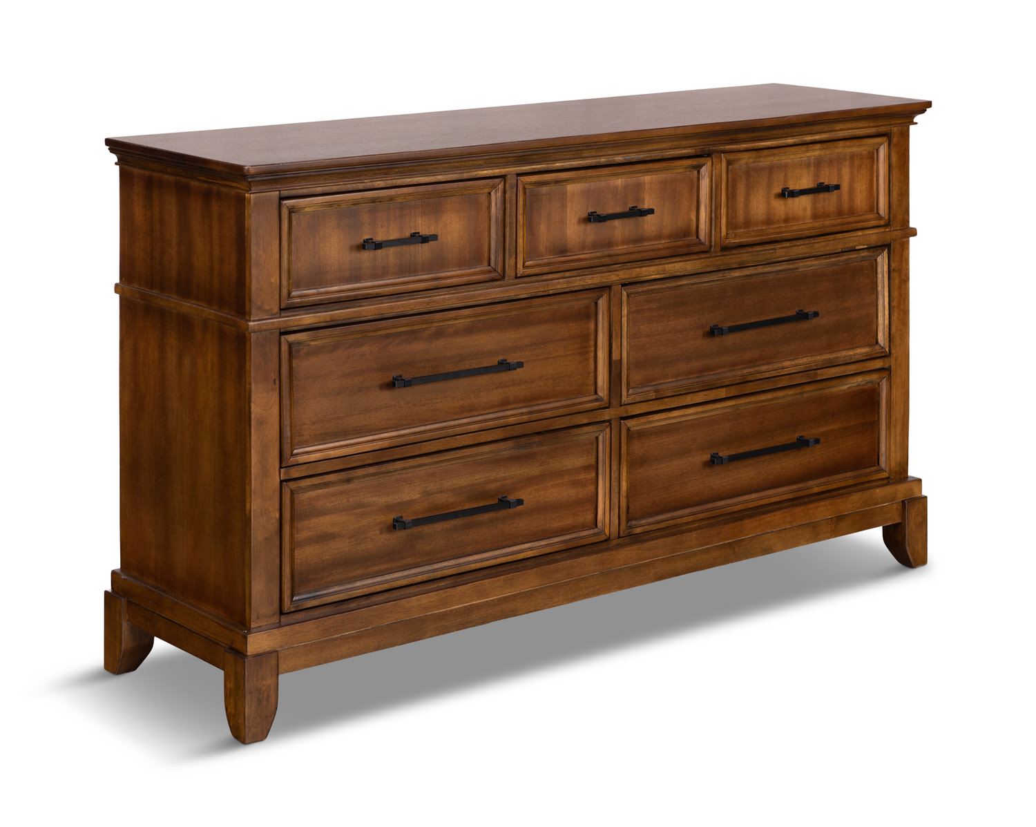 Introducing the Scofield 7 Drawer Dresser, a perfect blend of traditional and transitional styles. Crafted with high-quality wood material and featuring a rich medium finish, this dresser is both functional and stylish. The Okume veneer adds a touch of elegance, while the seven spacious drawers provide ample storage for your belongings. In a classic brown color, this dresser will complement any bedroom décor effortlessly. Upgrade your bedroom with the timeless appeal of the Scofield 7 Drawer Dresser.